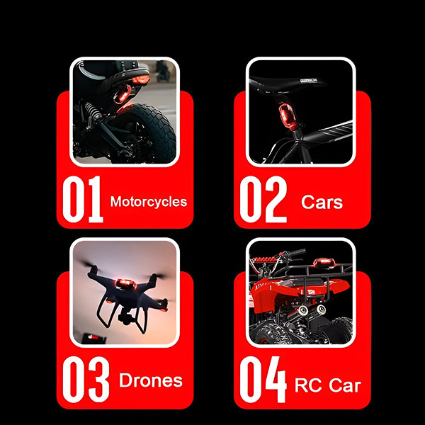 🚨 Ορατά από 100+ μέτρα – 7 χρώματα RGB και 3 λειτουργίες φωτισμού (γρήγορο strobe, αργό strobe, σταθερό) που αλλάζουν με το πάτημα ενός κουμπιού.