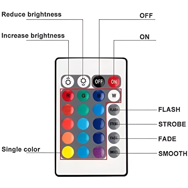 Το AQUASHEIN συνοδεύεται από ένα βολικό τηλεχειριστήριο που σας επιτρέπει να ρυθμίζετε το φωτισμό με ευκολία. Με 24 πλήκτρα, μπορείτε να επιλέξετε από 16 χρώματα RGB και τέσσερις δυναμικές λειτουργίες (φλας, στροβοσκόπιο, σβήσιμο, ομαλή λειτουργία). Ελέγξτε τα φώτα από απόσταση έως και 10 μέτρων, εξασφαλίζοντας προσαρμογή χωρίς προβλήματα.